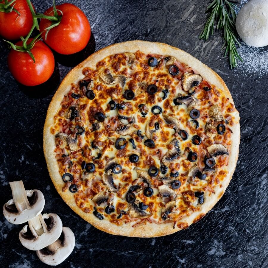 Ham, mushrooms, olives, mixed herbs, tomato sauce base