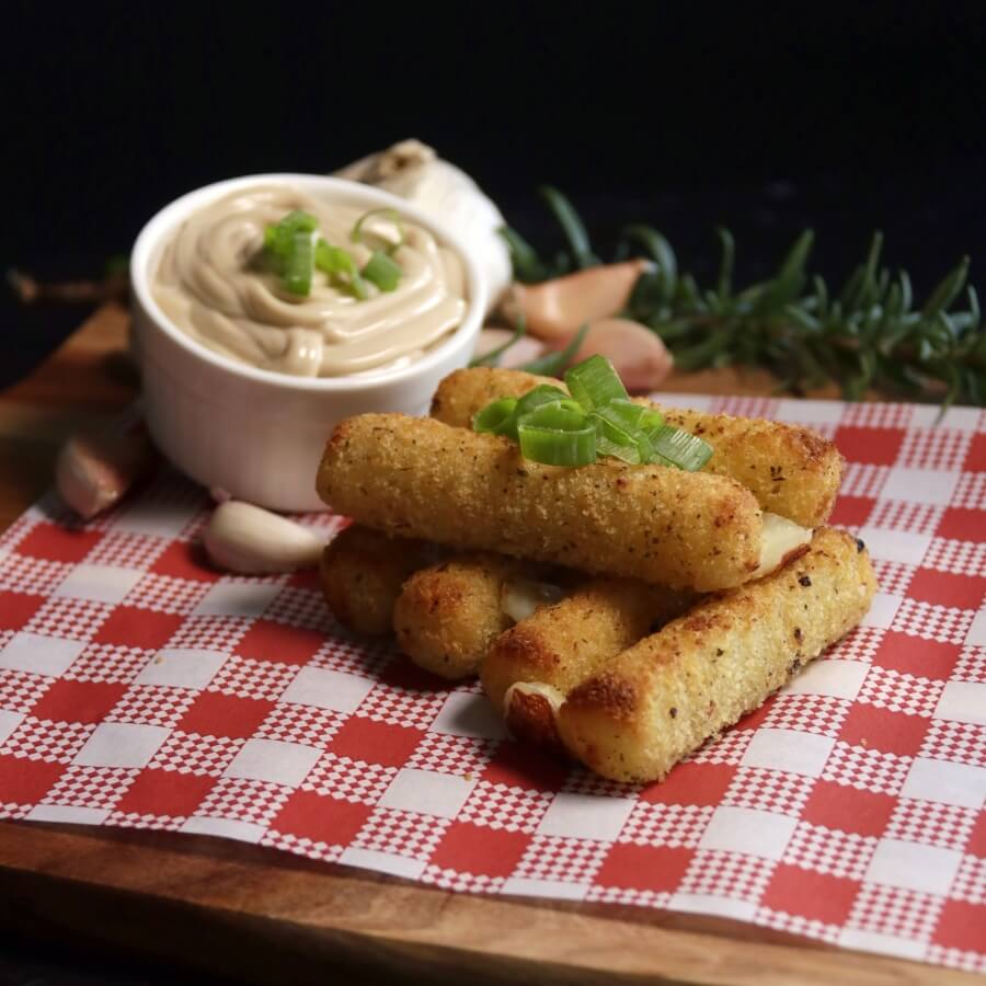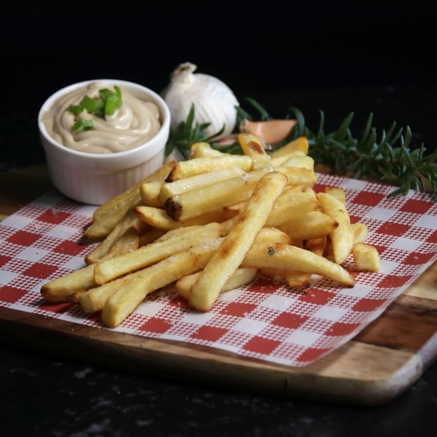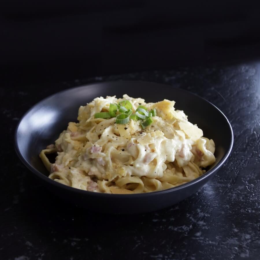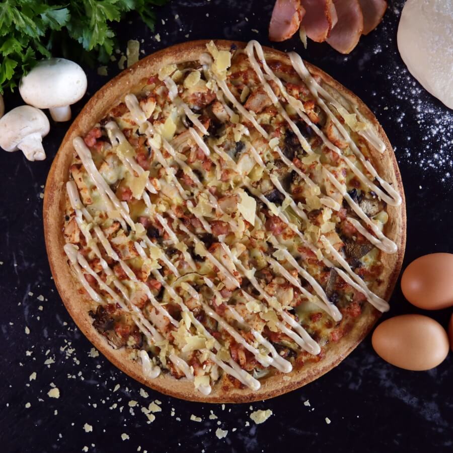 Sliced chicken breast fillet with diced bacon, whisked egg, fresh mushroom and onion served on a creamy garlic aioli base and topped with an extra swirl of garlic aioli and parmesan.