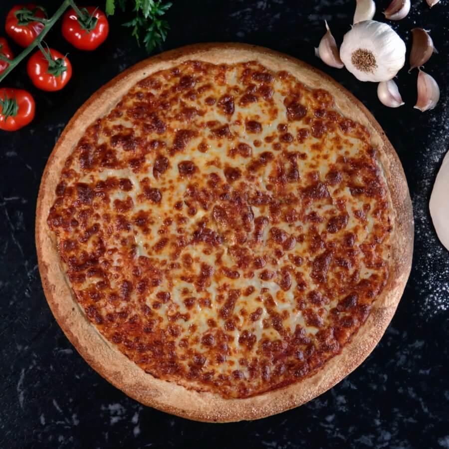 Just the right amount of mozzarella cheese on our signature tomato sauce base. (V)
