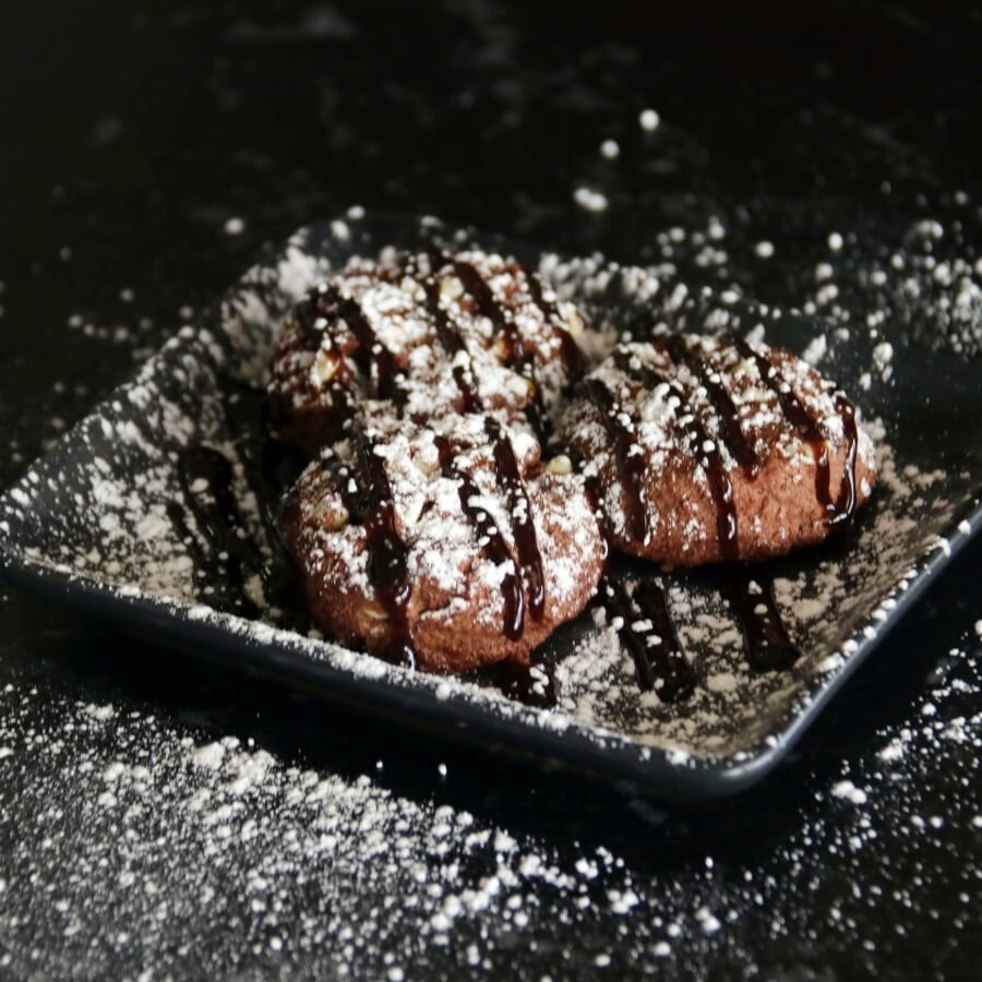 Three warm and gooey double chocolate cookie dough balls.
