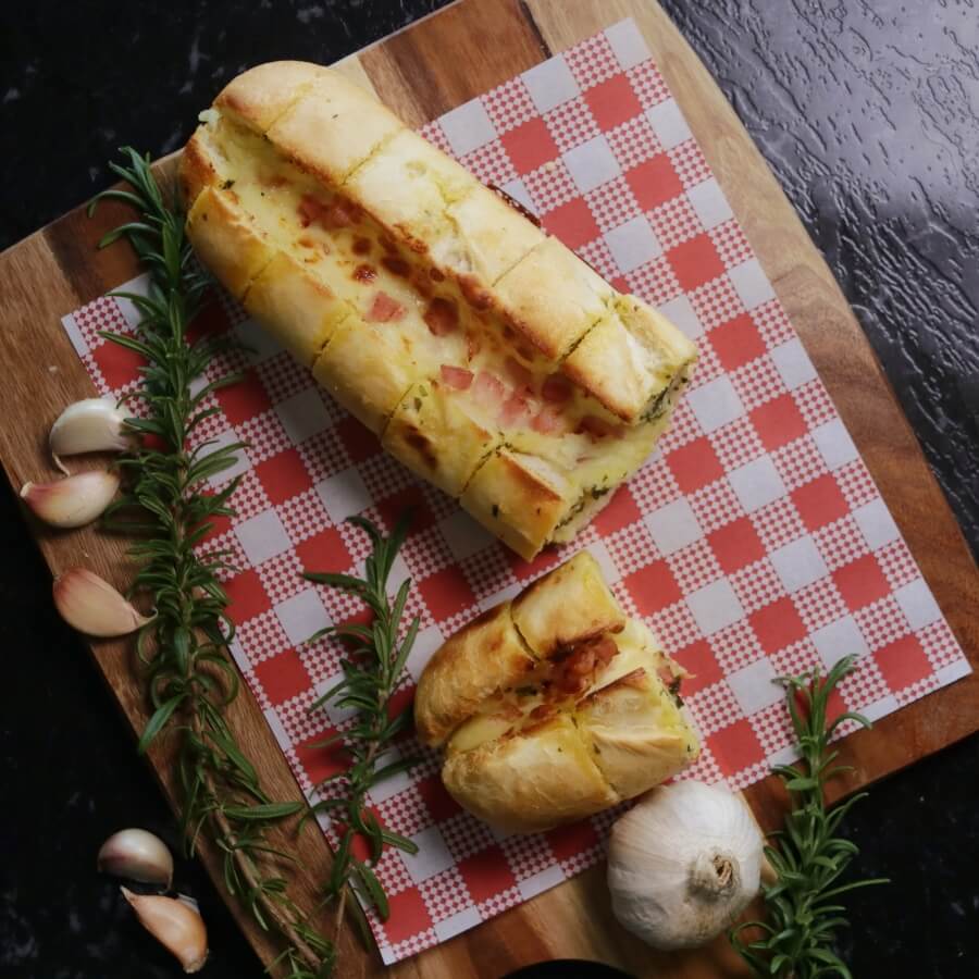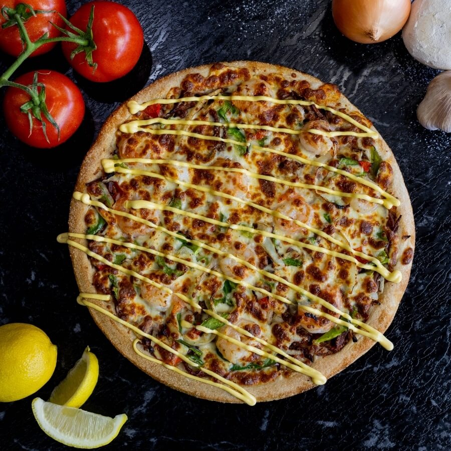 Marinated garlic prawns with fresh capsicum, onion and extra garlic served on our signature tomato sauce base and finished with a garlic aioli swirl and a lemon wedge.