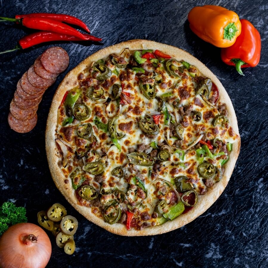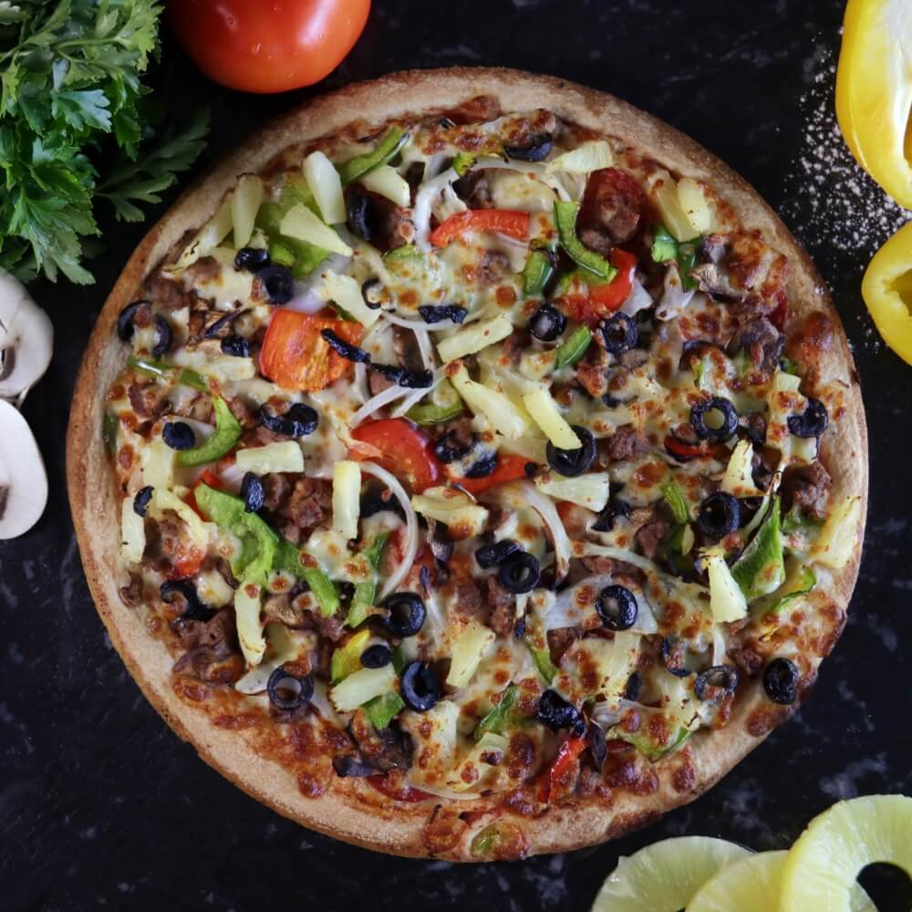 Pepperoni, ground beef, mushroom, onions, olives, capsicum and pineapple on our signature tomato sauce base + Make it extra Cheesy from $2