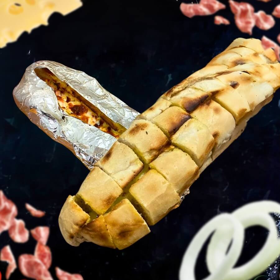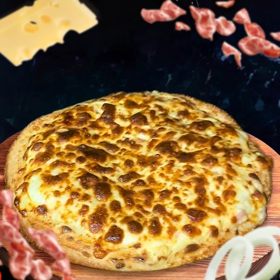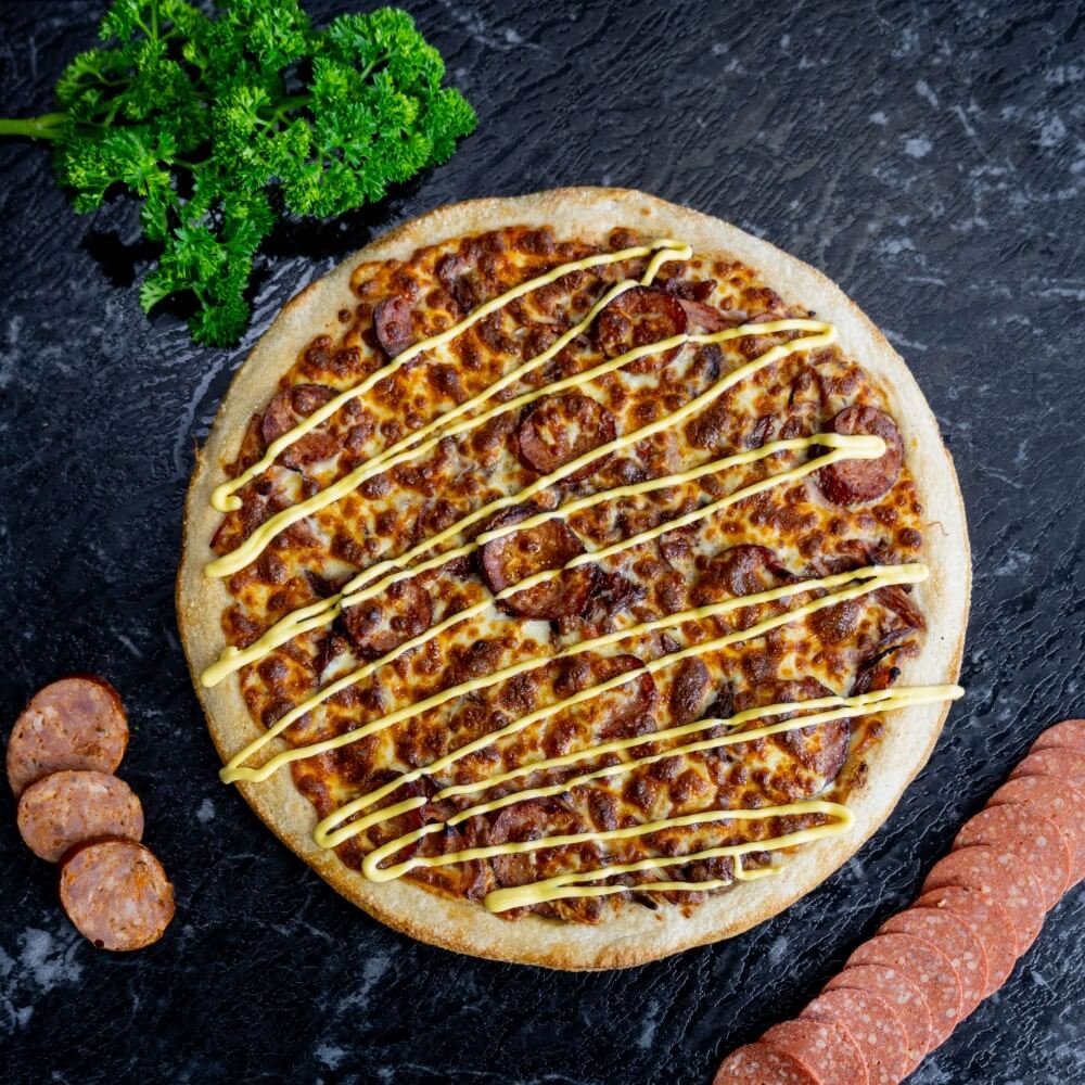 Double ground beef, diced bacon and a swirl of mayonnaise on our signature tomato sauce base